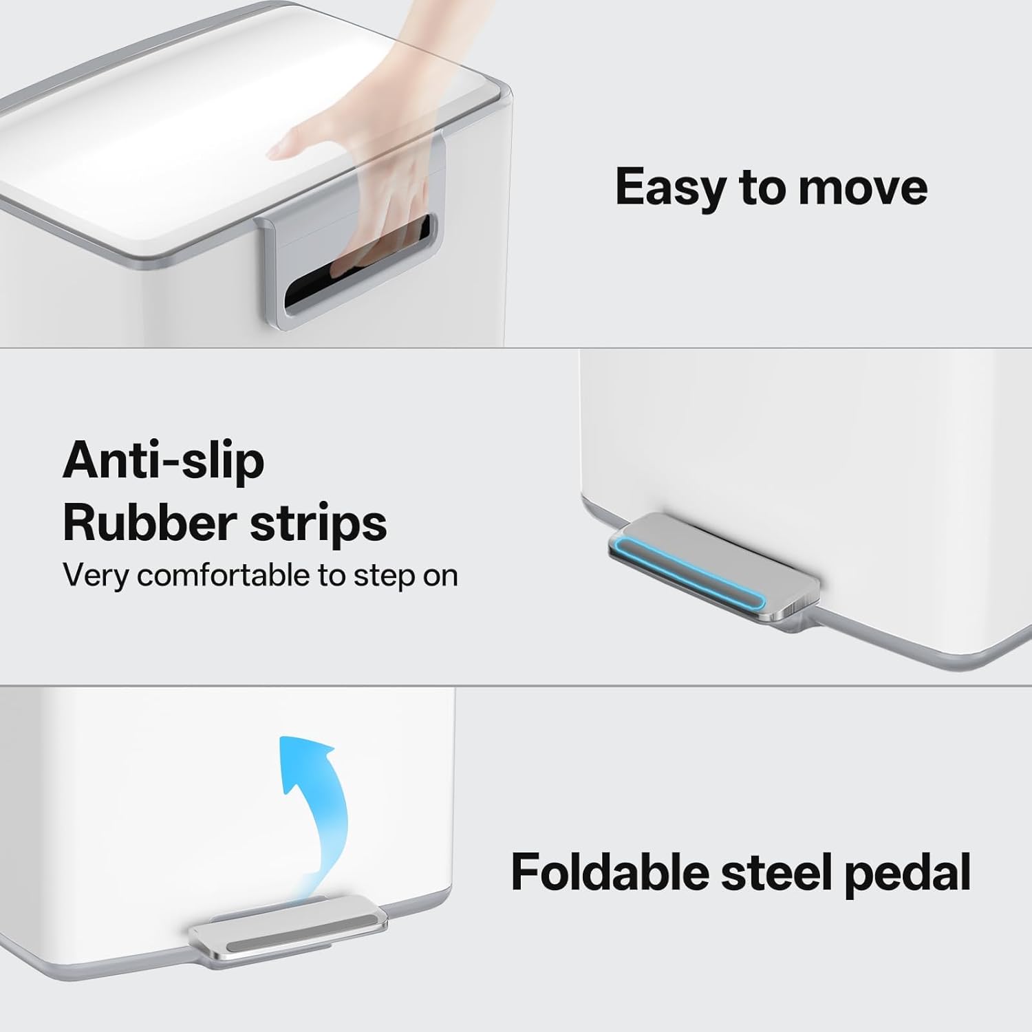 - Dwsign benefits: Garbage can with lid stays open, removable inner bucket, collapsable foot pedal and carrying handle, etc.